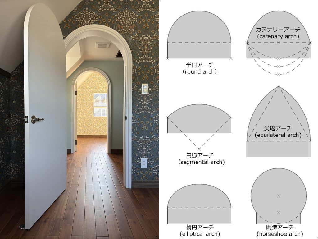 現代の柱と梁の構造ではアーチの構造検討は不要で、単純に形の好き嫌いで選べば良いのですが、インテリアの開口としては半円・円弧・楕円アーチが一般に好まれるようです。冒頭の事例では、小屋裏の斜め天井の下に無理のない形でなるべく高い開口となるように「半円アーチ」としました。アーチ開口は見た目もかわいらしく、存在が際立ってアクセントにもなるので、モダンなインテリアで採用してもよろしいかと思います。