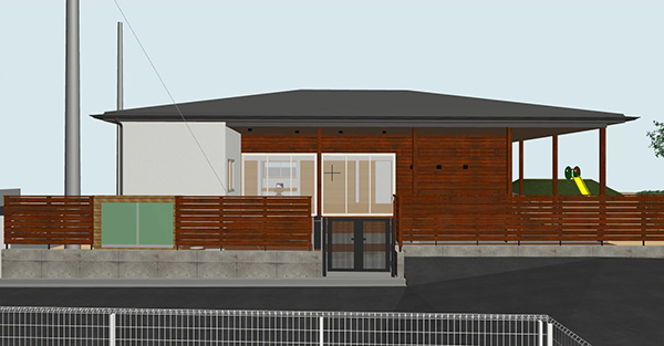 子育て支援・地域交流棟と幼稚園(子ども園)門扉入口が別々に計画されていますが、一体で利用できるように敷地内でゆるやかにつながっています。