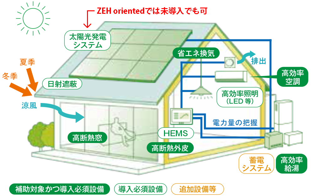 イメージとしては、冒頭添付図のような「大きな太陽光発電パネルが乗った切妻(きりつま)屋根の家」だと思いますが、国の補助金 55万円/戸 (2025年)の支給対象となる住宅で、太陽光発電パネルの設置が不要な「ZEH oriented(ゼッチ・オリエンテッド)」が存在することはご存知でしょうか?